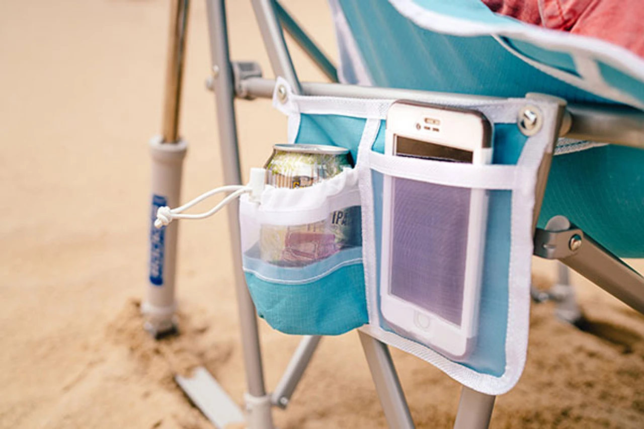 A rocking beach chair with canopy—in other words, your own personal oasis! An adjustable UPF 50 shade protects you from the sun, while the sling-style seat cradles you in comfort. Beverage holder and sleek side pocket for your phone. Contour of the fabric subtly creates a place to rest your arms Folds up compactly, fitting into the Large Mouth Carry Bag. Full-size rocker folds compact Spring Action Rocking Technology Structured sling-style seat for all-day comfort Contoured fabric creates subtle armrests Large Mouth Carry Bag Phone/media holder /li> Beverage holder Breathable mesh panels Powder-coated steel frame. UPF 50 Shade Canopy