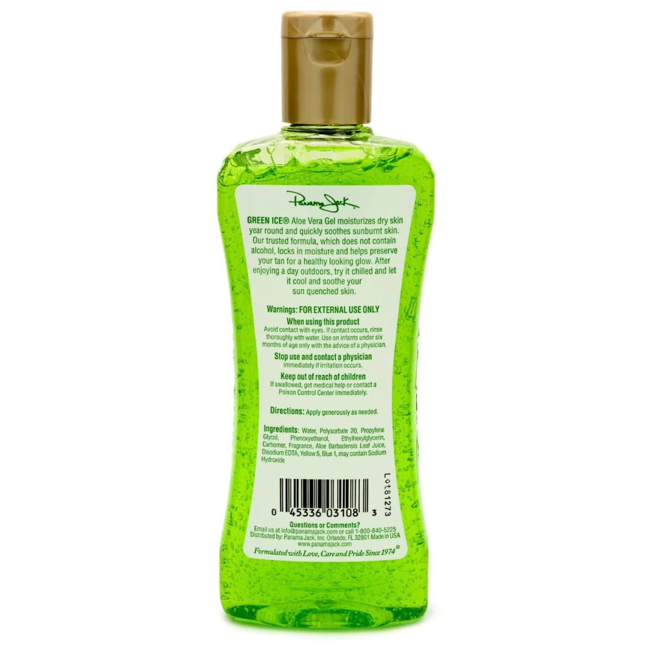 Escape Everyday®…Panama Jack Green Ice incorporates Aloe Vera gel to soothe, cool, moisturize and help relieve dry skin and sunburn symptoms. Helps to prevent peeling and prolongs your tan Contains no alcohol Multi-purpose, effervescent gel not only soothes sunburns, but can help to treat cuts, clear up rashes, take the stings out of bug bites, calm shaving burns and much more 8-ounce new consumer-friendly bottle with dispensing cap