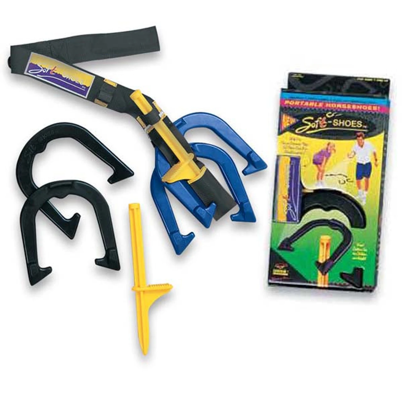 Saturnian 1 Soft Shoes is the safe alternative to the traditional horseshoe game. Soft Shoes comes with four numbered, natural rubber shoes, two sturdy step-in-pegs, and a 3' carry strap for easy measuring between pegs and portability. Soft Shoes playing instructions sewn onto back of carry strap.