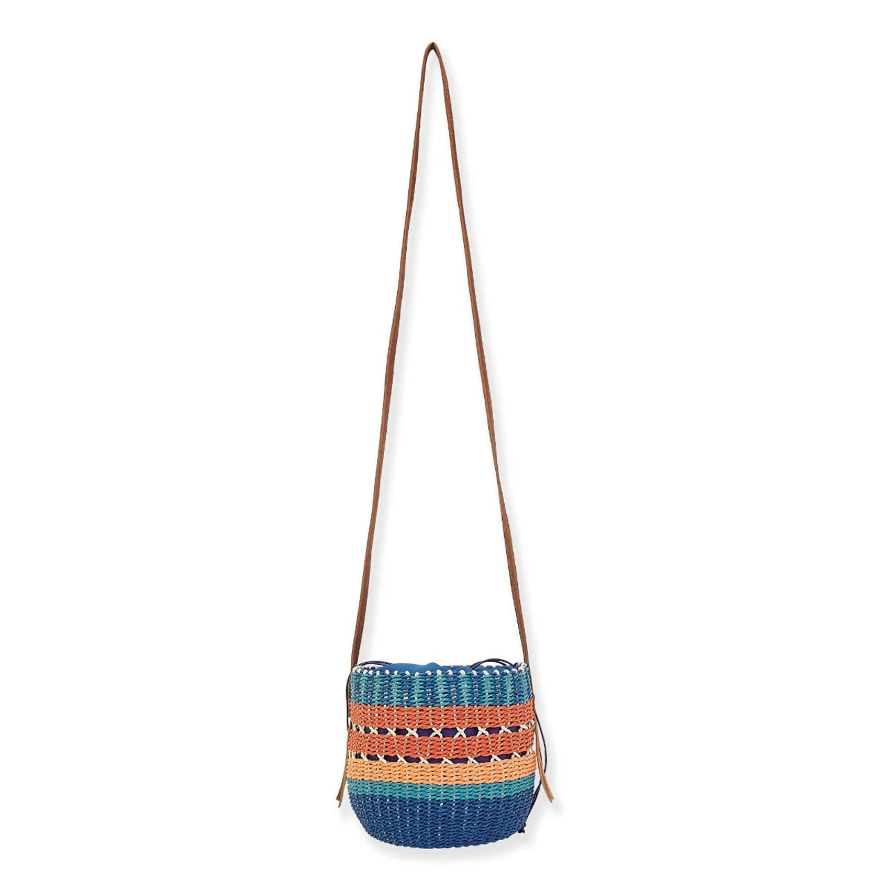 This fun colorful purse will go with mulitple outfits! Shape: Crossbody Exterior Size: 6" x 6" x 6.5" Closure: Draw String Strap Drop: 24" Material: Natural Straw Pockets: Interior Lining: Cotton